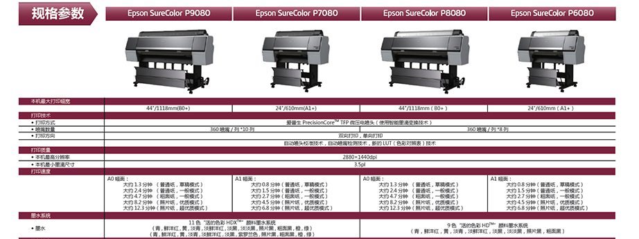 對(duì)開幅面:EPSON P6080 (9色) EPSON P7080 (11色)